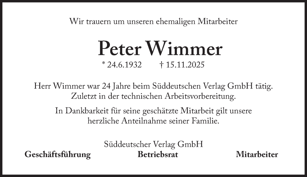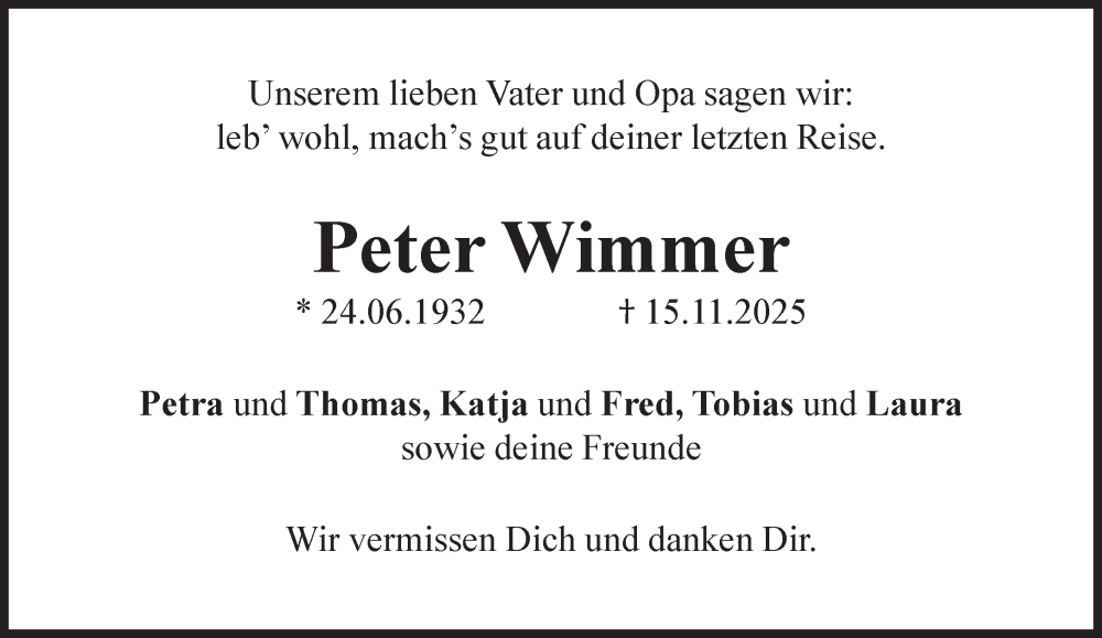 Hier finden Sie alle Traueranzeigen aus der Zeitung, die bisher für Peter Wimmer erschienen sind. Weitere Traueranzeigen, die in der Zeitung erscheinen, werden hier ebenfalls aufgelistet