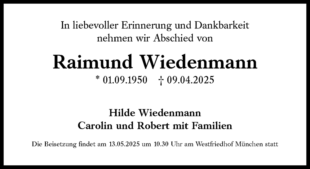 Hier finden Sie alle Traueranzeigen aus der Zeitung, die bisher für Raimund Wiedenmann erschienen sind. Weitere Traueranzeigen, die in der Zeitung erscheinen, werden hier ebenfalls aufgelistet