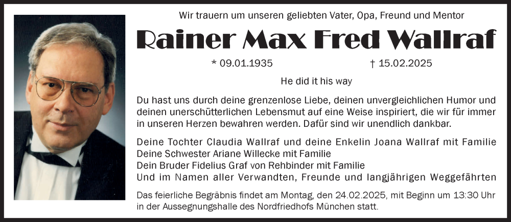 Hier finden Sie alle Traueranzeigen aus der Zeitung, die bisher für Rainer Max Fred Wallraf erschienen sind. Weitere Traueranzeigen, die in der Zeitung erscheinen, werden hier ebenfalls aufgelistet