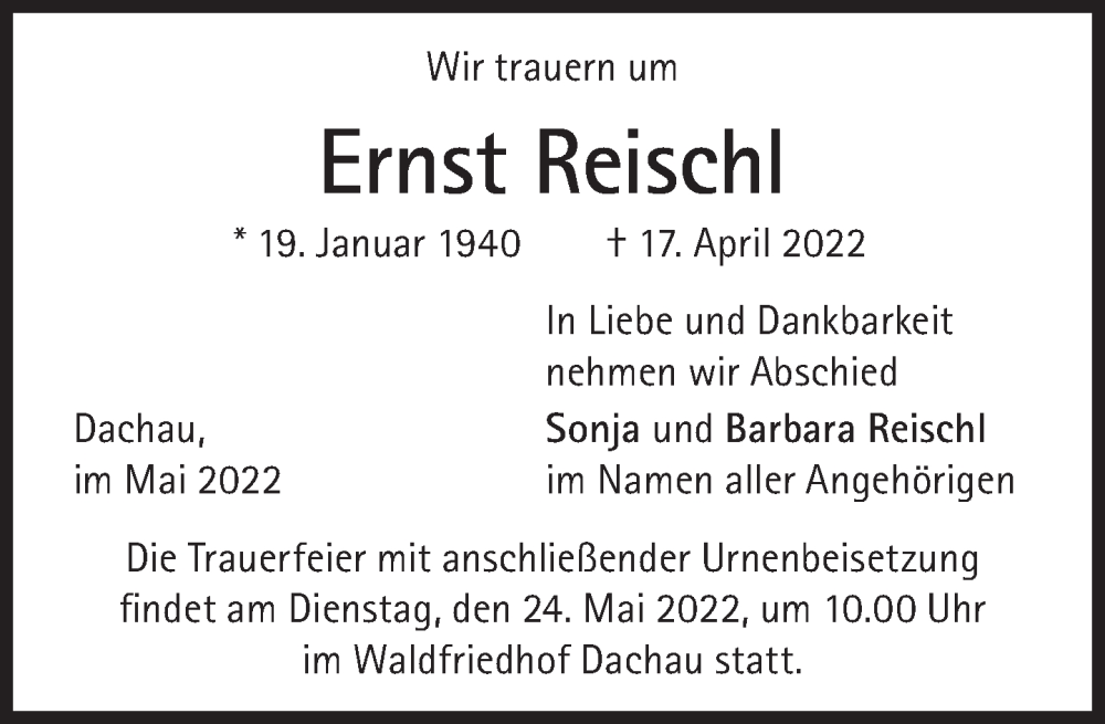 Hier finden Sie alle Traueranzeigen aus der Zeitung, die bisher für Reischl Ernst erschienen sind. Weitere Traueranzeigen, die in der Zeitung erscheinen, werden hier ebenfalls aufgelistet