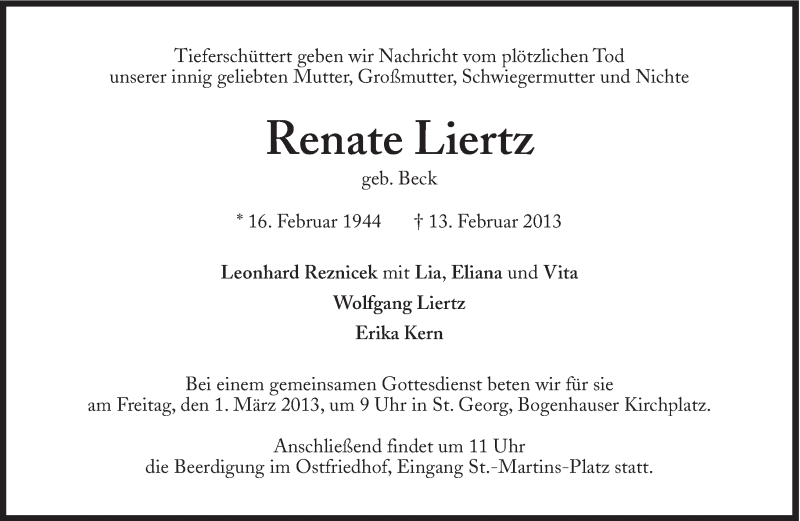 Hier finden Sie alle Traueranzeigen aus der Zeitung, die bisher für Renate Liertz erschienen sind. Weitere Traueranzeigen, die in der Zeitung erscheinen, werden hier ebenfalls aufgelistet