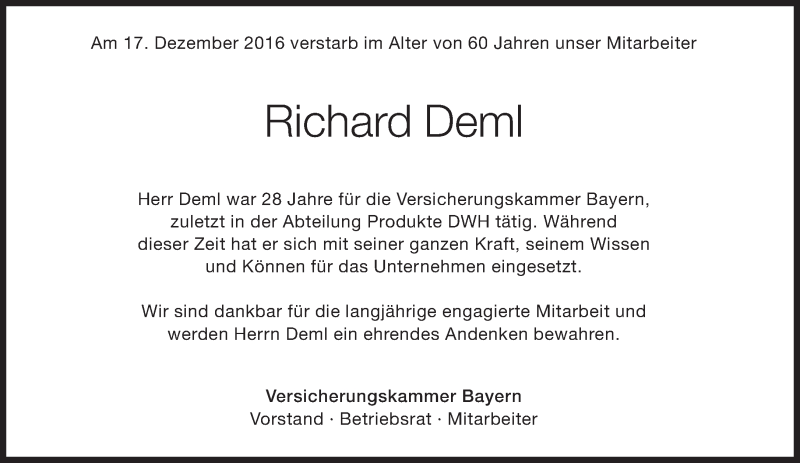 Hier finden Sie alle Traueranzeigen aus der Zeitung, die bisher für Richard Deml erschienen sind. Weitere Traueranzeigen, die in der Zeitung erscheinen, werden hier ebenfalls aufgelistet