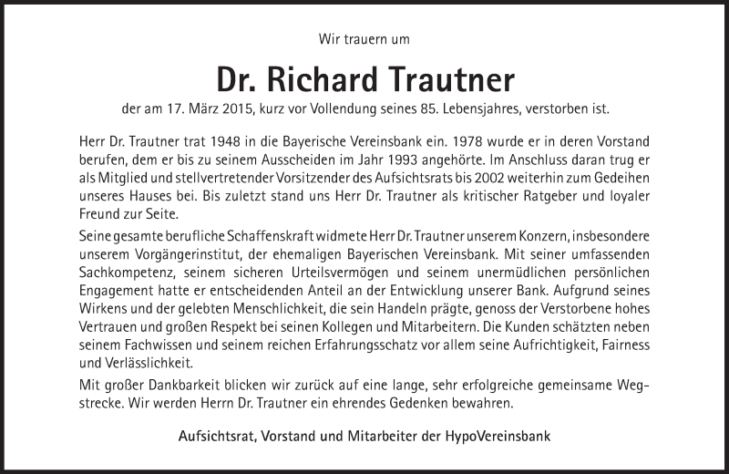 Hier finden Sie alle Traueranzeigen aus der Zeitung, die bisher für Richard Trautner erschienen sind. Weitere Traueranzeigen, die in der Zeitung erscheinen, werden hier ebenfalls aufgelistet