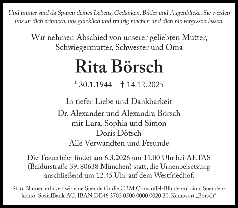 Hier finden Sie alle Traueranzeigen aus der Zeitung, die bisher für Rita Börsch erschienen sind. Weitere Traueranzeigen, die in der Zeitung erscheinen, werden hier ebenfalls aufgelistet