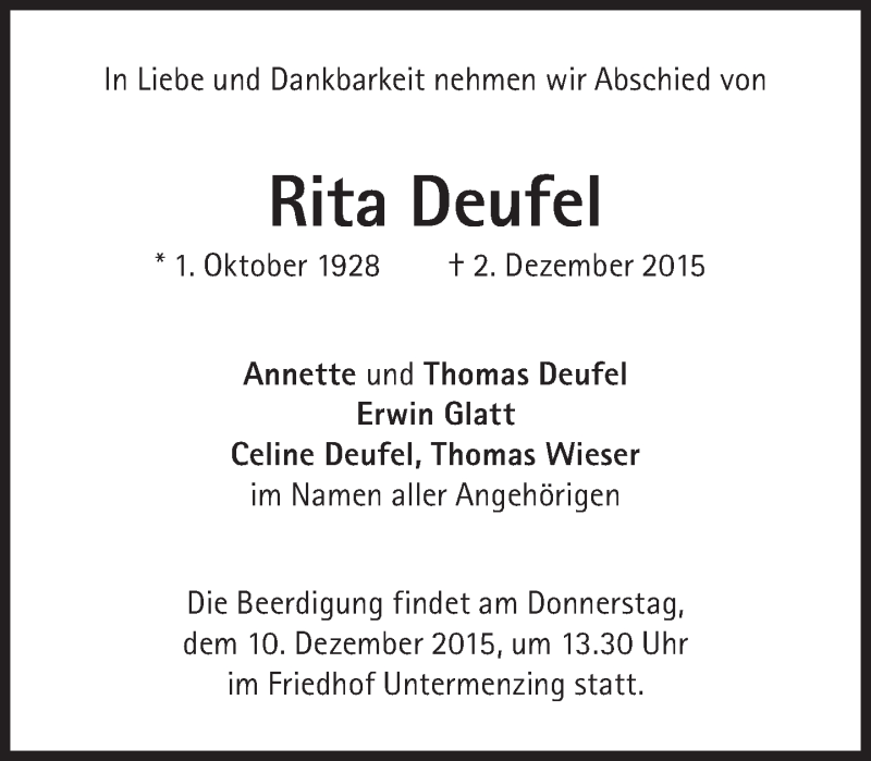 Hier finden Sie alle Traueranzeigen aus der Zeitung, die bisher für Rita Deufel erschienen sind. Weitere Traueranzeigen, die in der Zeitung erscheinen, werden hier ebenfalls aufgelistet