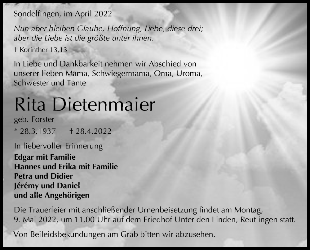 Hier finden Sie alle Traueranzeigen aus der Zeitung, die bisher für Rita Dietenmaier erschienen sind. Weitere Traueranzeigen, die in der Zeitung erscheinen, werden hier ebenfalls aufgelistet