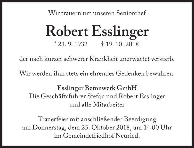 Hier finden Sie alle Traueranzeigen aus der Zeitung, die bisher für Robert Esslinger erschienen sind. Weitere Traueranzeigen, die in der Zeitung erscheinen, werden hier ebenfalls aufgelistet