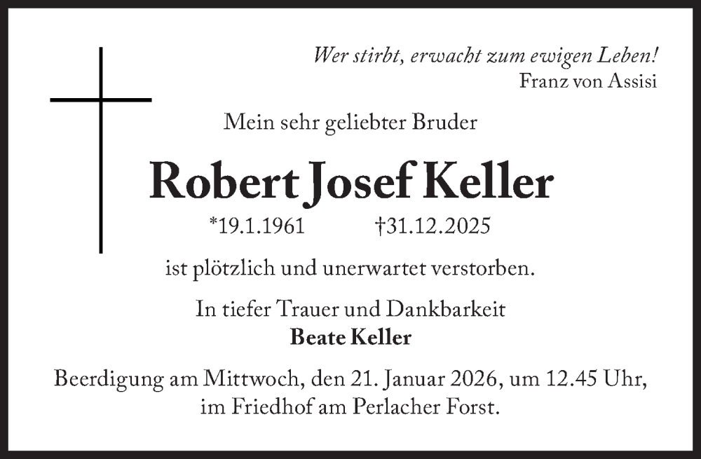 Hier finden Sie alle Traueranzeigen aus der Zeitung, die bisher für Robert Josef Keller erschienen sind. Weitere Traueranzeigen, die in der Zeitung erscheinen, werden hier ebenfalls aufgelistet