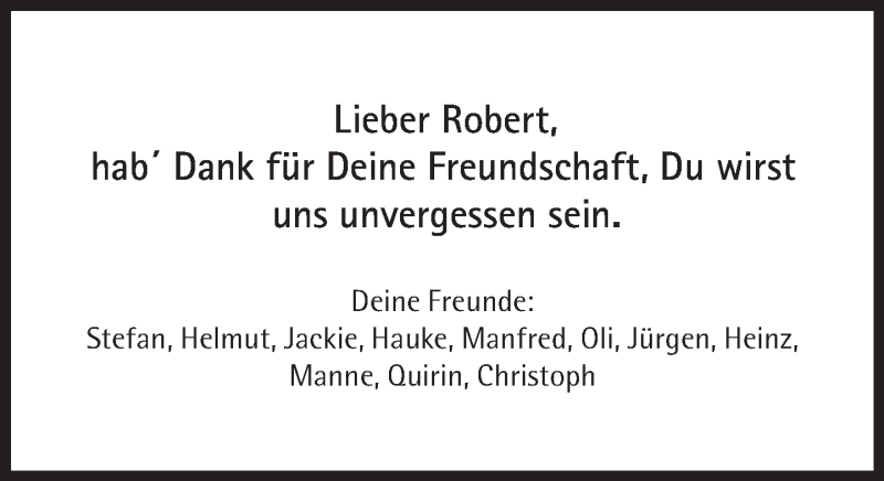 Hier finden Sie alle Traueranzeigen aus der Zeitung, die bisher für Robert Peters erschienen sind. Weitere Traueranzeigen, die in der Zeitung erscheinen, werden hier ebenfalls aufgelistet