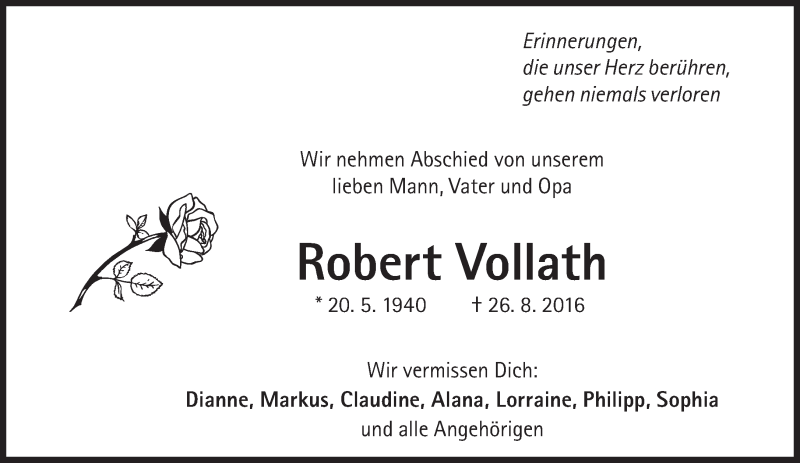 Hier finden Sie alle Traueranzeigen aus der Zeitung, die bisher für Robert Vollath erschienen sind. Weitere Traueranzeigen, die in der Zeitung erscheinen, werden hier ebenfalls aufgelistet