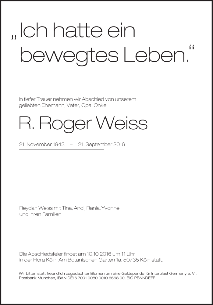 Hier finden Sie alle Traueranzeigen aus der Zeitung, die bisher für Roger Weiss erschienen sind. Weitere Traueranzeigen, die in der Zeitung erscheinen, werden hier ebenfalls aufgelistet