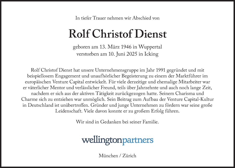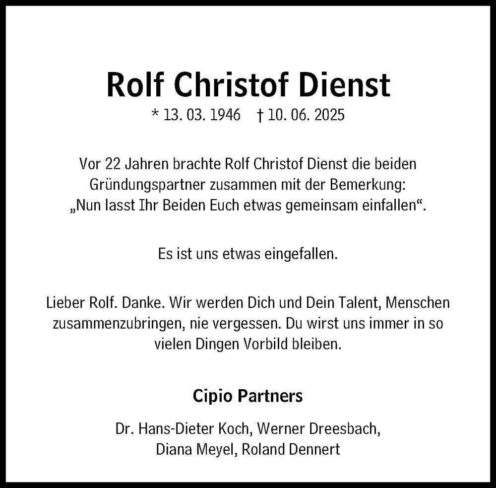 Hier finden Sie alle Traueranzeigen aus der Zeitung, die bisher für Rolf Christof Dienst erschienen sind. Weitere Traueranzeigen, die in der Zeitung erscheinen, werden hier ebenfalls aufgelistet