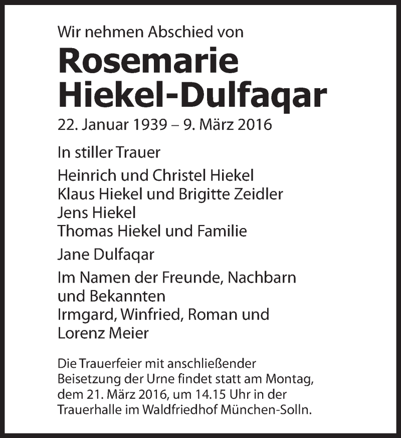 Hier finden Sie alle Traueranzeigen aus der Zeitung, die bisher für Rosemarie Hiekel-Dulfaqar erschienen sind. Weitere Traueranzeigen, die in der Zeitung erscheinen, werden hier ebenfalls aufgelistet
