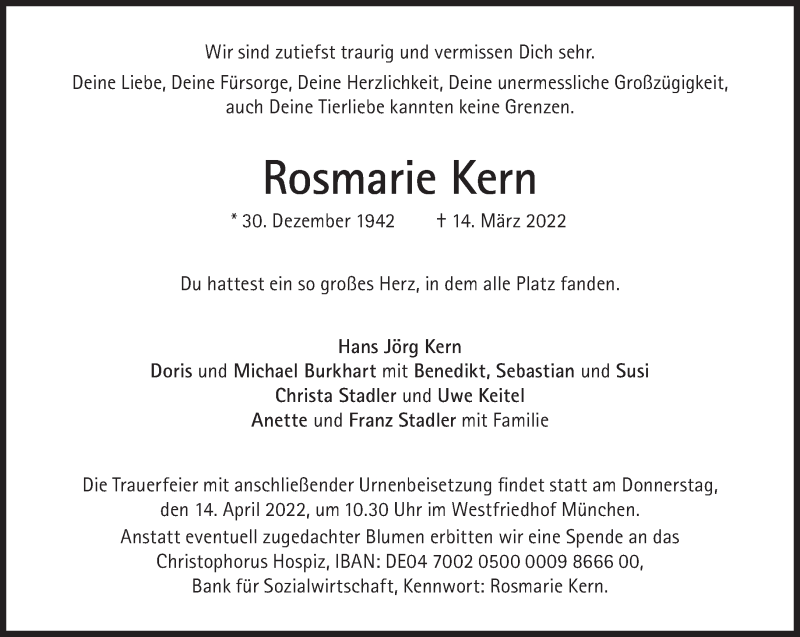 Hier finden Sie alle Traueranzeigen aus der Zeitung, die bisher für Rosemarie Kern erschienen sind. Weitere Traueranzeigen, die in der Zeitung erscheinen, werden hier ebenfalls aufgelistet