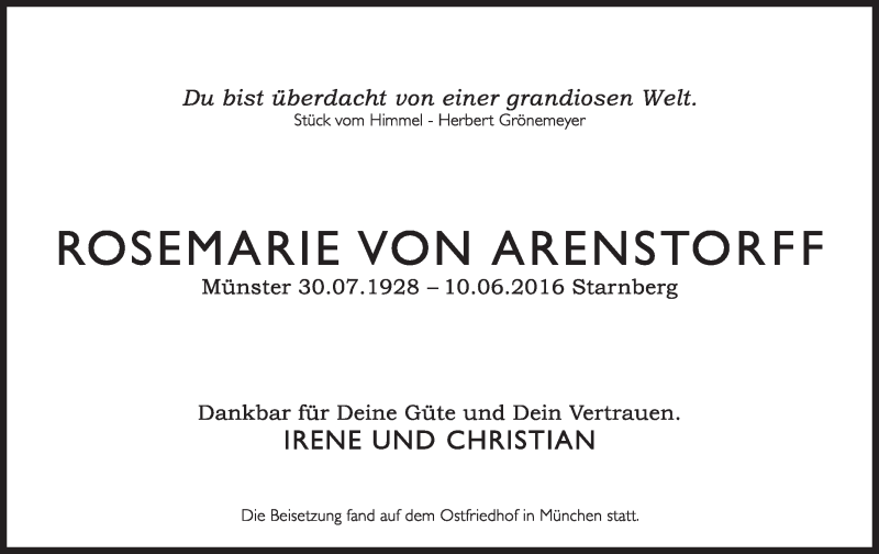 Hier finden Sie alle Traueranzeigen aus der Zeitung, die bisher für Rosemarie von Arenstorff erschienen sind. Weitere Traueranzeigen, die in der Zeitung erscheinen, werden hier ebenfalls aufgelistet