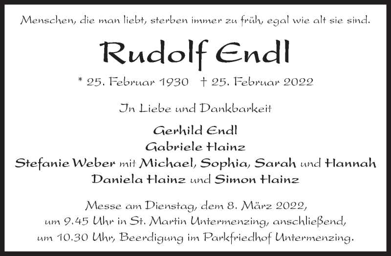 Hier finden Sie alle Traueranzeigen aus der Zeitung, die bisher für Rudolf Endl erschienen sind. Weitere Traueranzeigen, die in der Zeitung erscheinen, werden hier ebenfalls aufgelistet