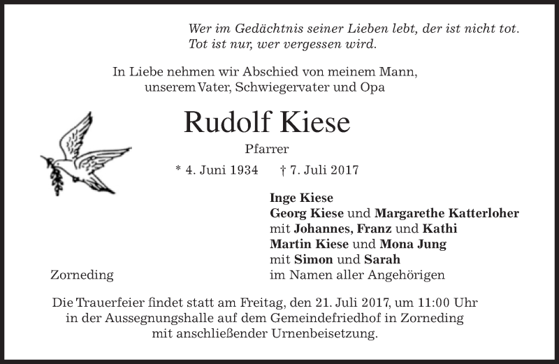 Hier finden Sie alle Traueranzeigen aus der Zeitung, die bisher für Rudolf Kiese erschienen sind. Weitere Traueranzeigen, die in der Zeitung erscheinen, werden hier ebenfalls aufgelistet