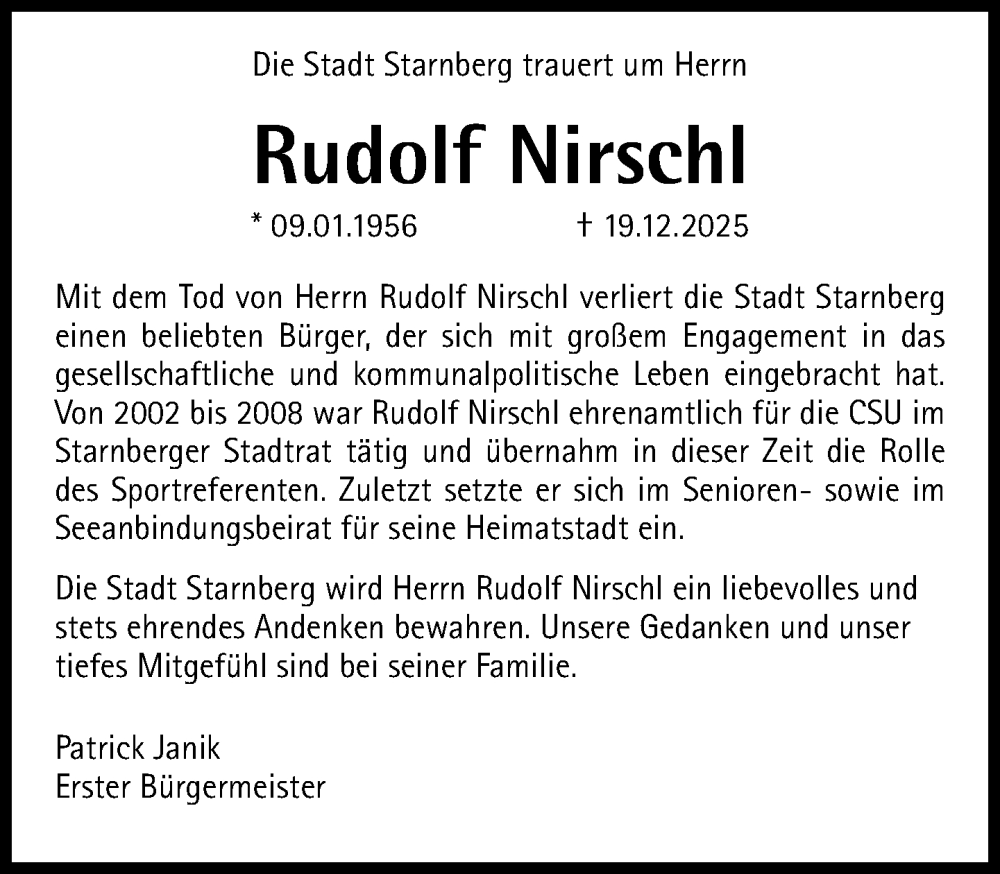 Hier finden Sie alle Traueranzeigen aus der Zeitung, die bisher für Rudolf Nirschl erschienen sind. Weitere Traueranzeigen, die in der Zeitung erscheinen, werden hier ebenfalls aufgelistet