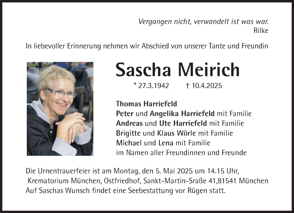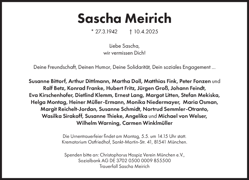 Hier finden Sie alle Traueranzeigen aus der Zeitung, die bisher für Sascha Meirich erschienen sind. Weitere Traueranzeigen, die in der Zeitung erscheinen, werden hier ebenfalls aufgelistet