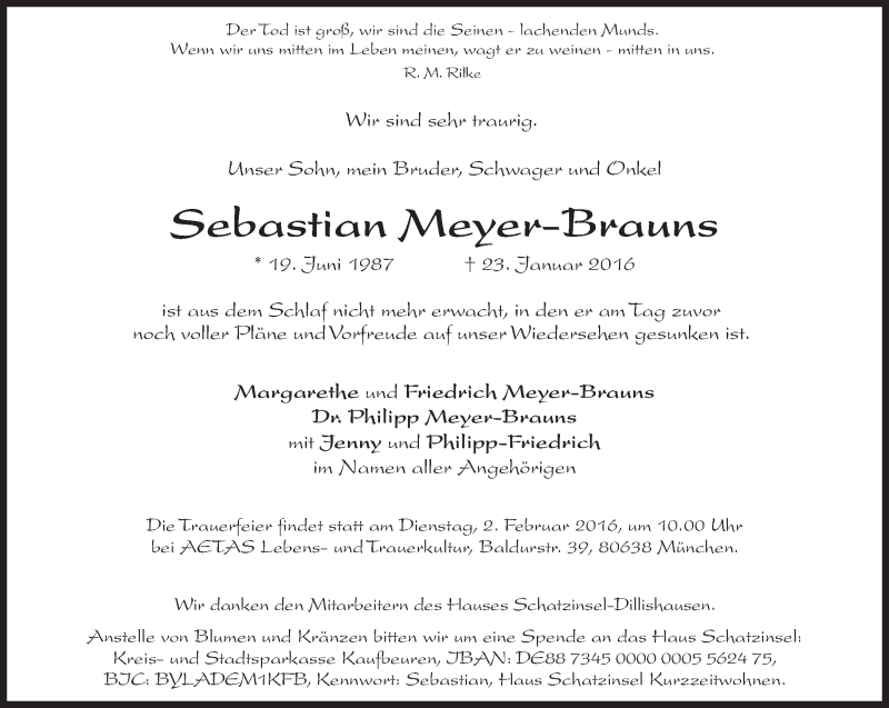 Hier finden Sie alle Traueranzeigen aus der Zeitung, die bisher für Sebastian Meyer-Brauns erschienen sind. Weitere Traueranzeigen, die in der Zeitung erscheinen, werden hier ebenfalls aufgelistet