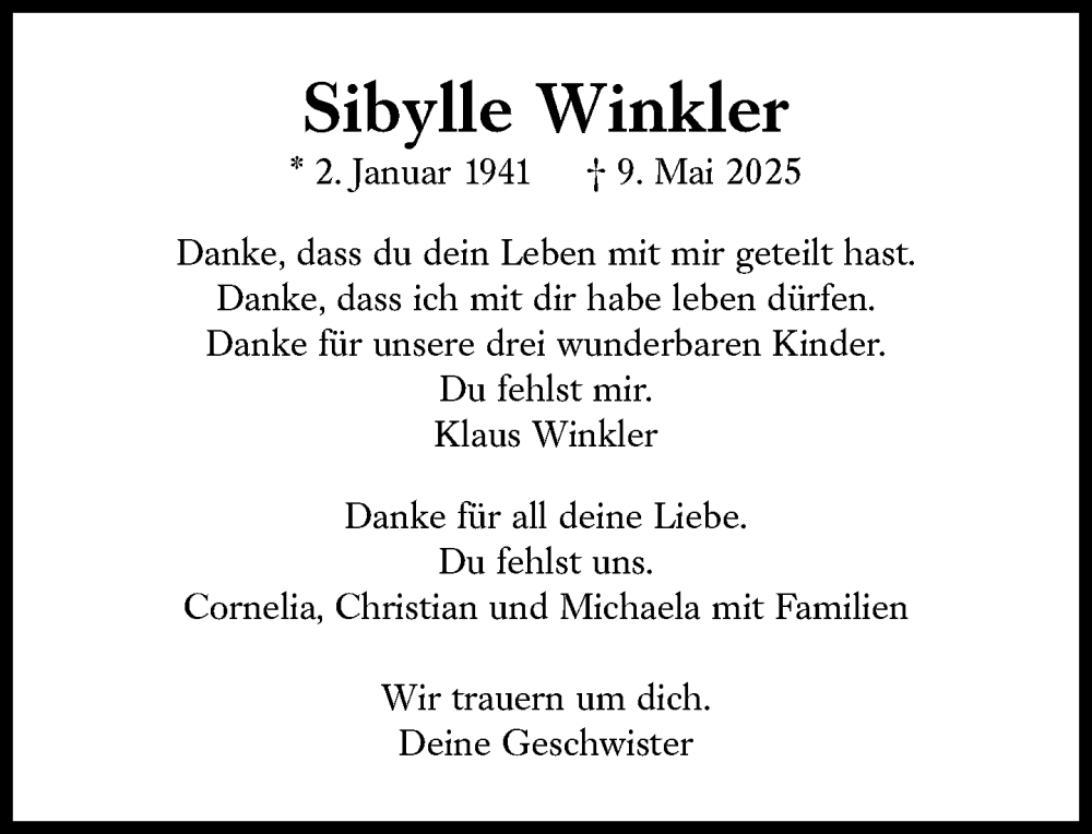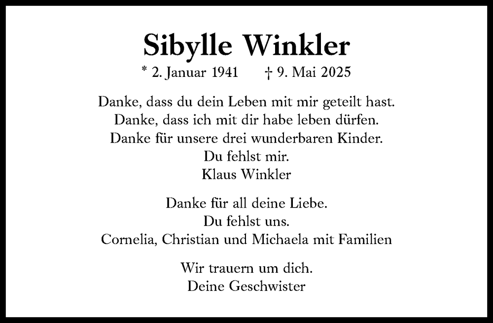 Hier finden Sie alle Traueranzeigen aus der Zeitung, die bisher für Sibylle Winkler erschienen sind. Weitere Traueranzeigen, die in der Zeitung erscheinen, werden hier ebenfalls aufgelistet