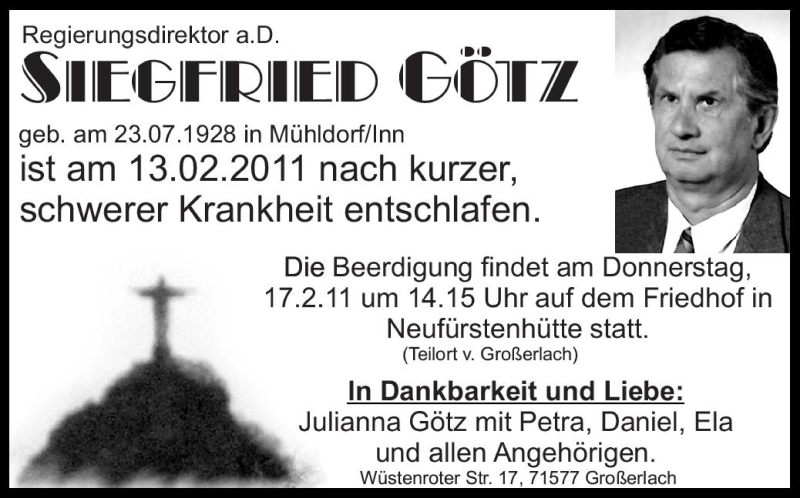 Hier finden Sie alle Traueranzeigen aus der Zeitung, die bisher für Siegfried Götz erschienen sind. Weitere Traueranzeigen, die in der Zeitung erscheinen, werden hier ebenfalls aufgelistet