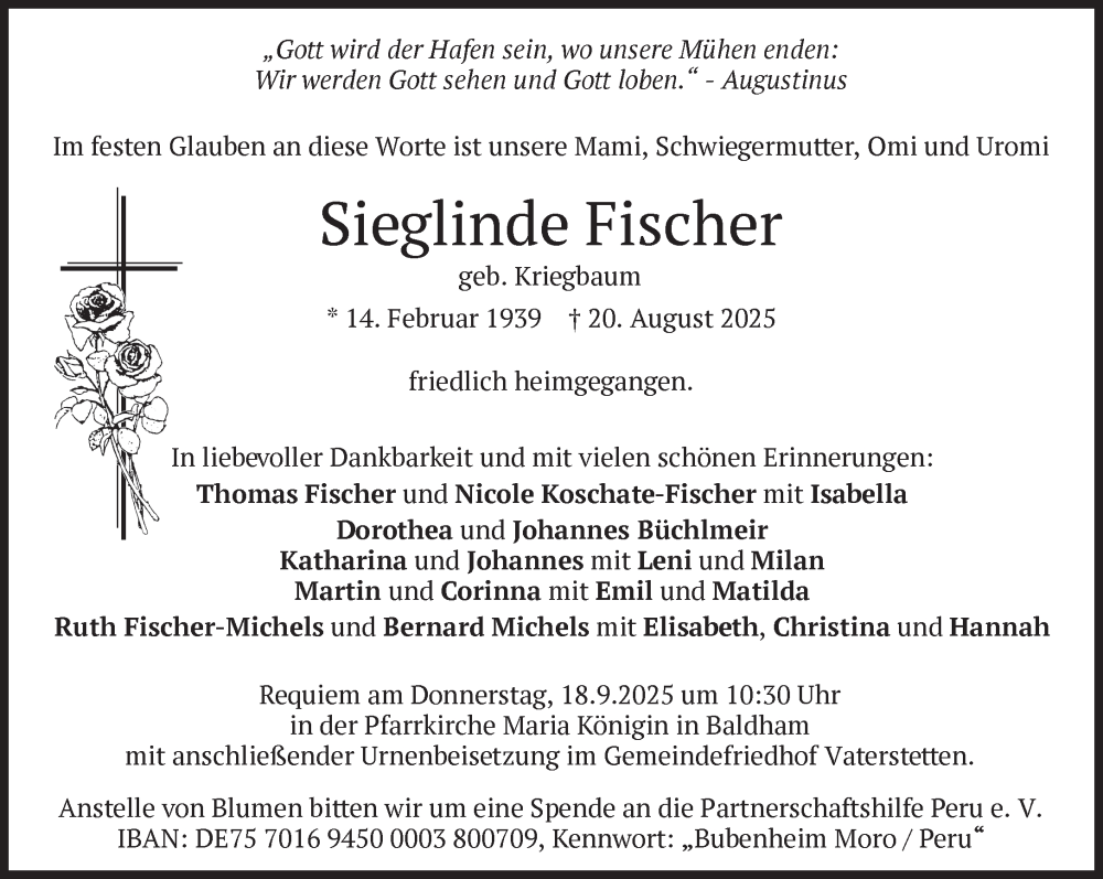 Hier finden Sie alle Traueranzeigen aus der Zeitung, die bisher für Sieglinde Fischer erschienen sind. Weitere Traueranzeigen, die in der Zeitung erscheinen, werden hier ebenfalls aufgelistet