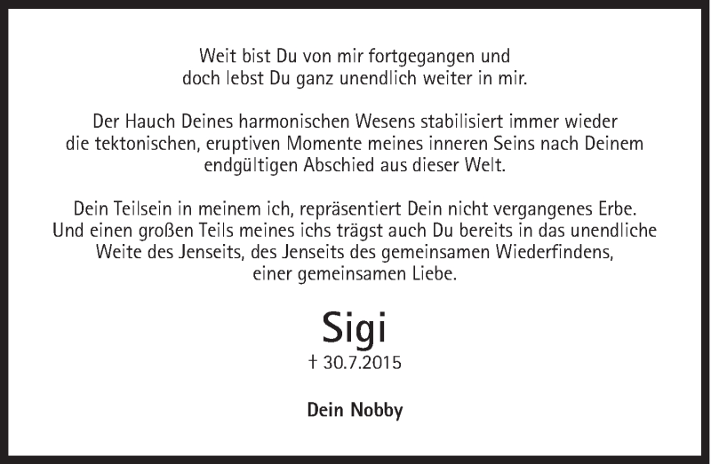 Hier finden Sie alle Traueranzeigen aus der Zeitung, die bisher für Sigi erschienen sind. Weitere Traueranzeigen, die in der Zeitung erscheinen, werden hier ebenfalls aufgelistet