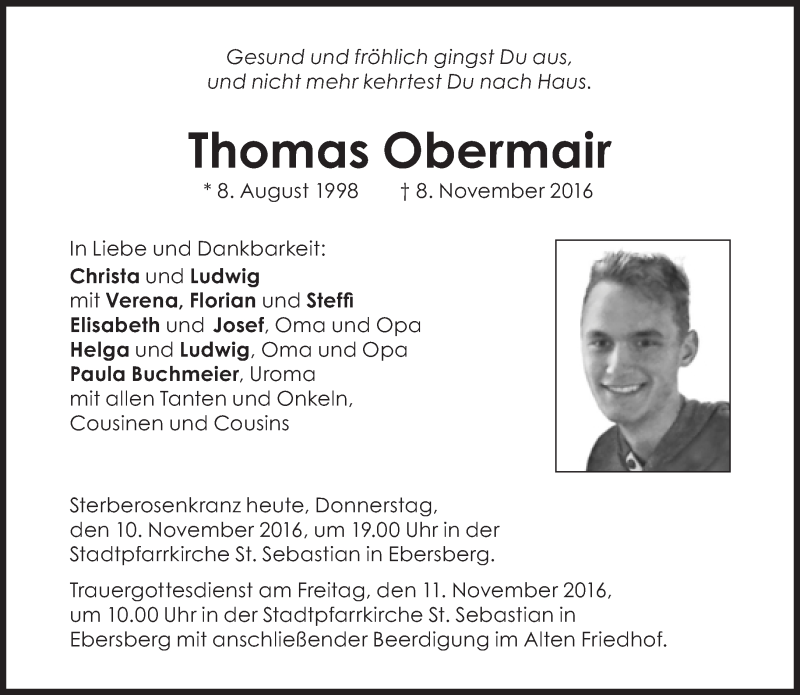Hier finden Sie alle Traueranzeigen aus der Zeitung, die bisher für Thomas Obermair erschienen sind. Weitere Traueranzeigen, die in der Zeitung erscheinen, werden hier ebenfalls aufgelistet