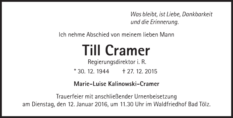 Hier finden Sie alle Traueranzeigen aus der Zeitung, die bisher für Till Cramer erschienen sind. Weitere Traueranzeigen, die in der Zeitung erscheinen, werden hier ebenfalls aufgelistet