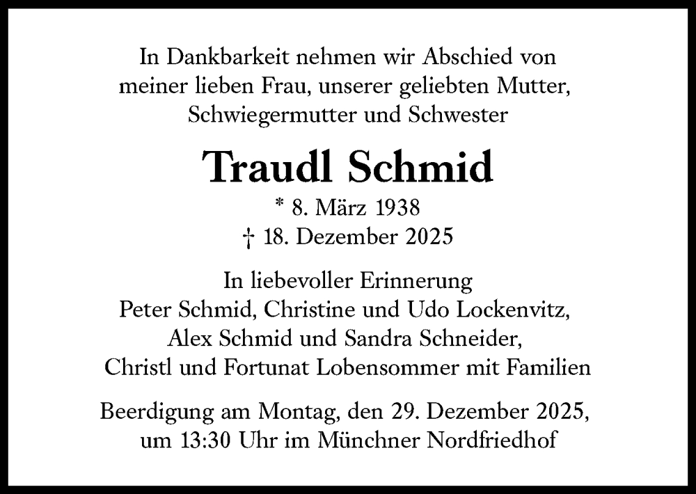 Hier finden Sie alle Traueranzeigen aus der Zeitung, die bisher für Traudl Schmid erschienen sind. Weitere Traueranzeigen, die in der Zeitung erscheinen, werden hier ebenfalls aufgelistet