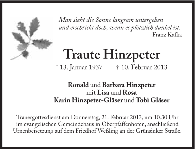 Hier finden Sie alle Traueranzeigen aus der Zeitung, die bisher für Traute Hinzpeter erschienen sind. Weitere Traueranzeigen, die in der Zeitung erscheinen, werden hier ebenfalls aufgelistet