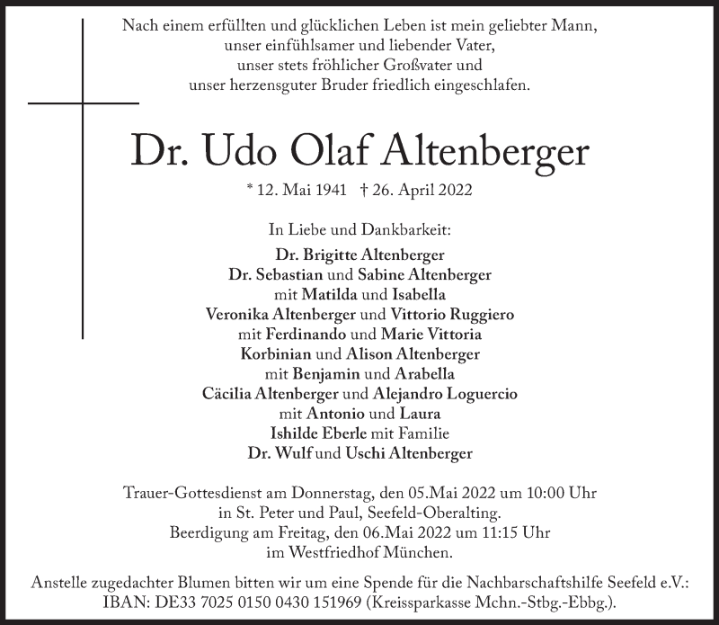 Hier finden Sie alle Traueranzeigen aus der Zeitung, die bisher für Udo Olaf Altenberger erschienen sind. Weitere Traueranzeigen, die in der Zeitung erscheinen, werden hier ebenfalls aufgelistet