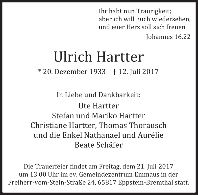 Hier finden Sie alle Traueranzeigen aus der Zeitung, die bisher für Ulrich Hartter erschienen sind. Weitere Traueranzeigen, die in der Zeitung erscheinen, werden hier ebenfalls aufgelistet
