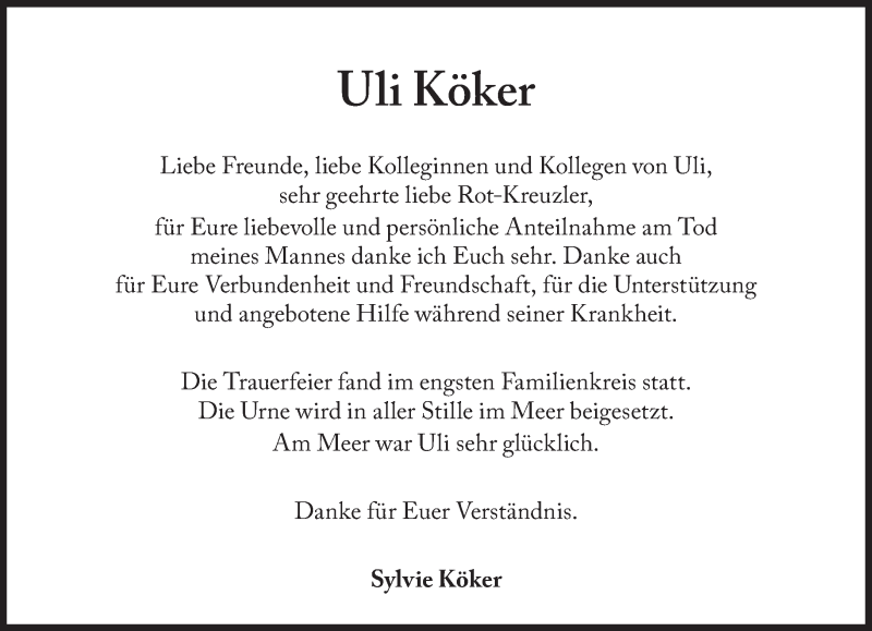 Hier finden Sie alle Traueranzeigen aus der Zeitung, die bisher für Ulrich Köker erschienen sind. Weitere Traueranzeigen, die in der Zeitung erscheinen, werden hier ebenfalls aufgelistet