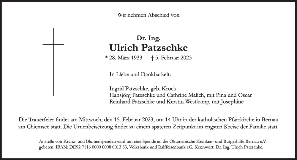 Hier finden Sie alle Traueranzeigen aus der Zeitung, die bisher für Ulrich Patzschke erschienen sind. Weitere Traueranzeigen, die in der Zeitung erscheinen, werden hier ebenfalls aufgelistet