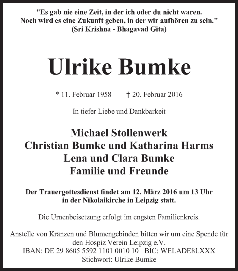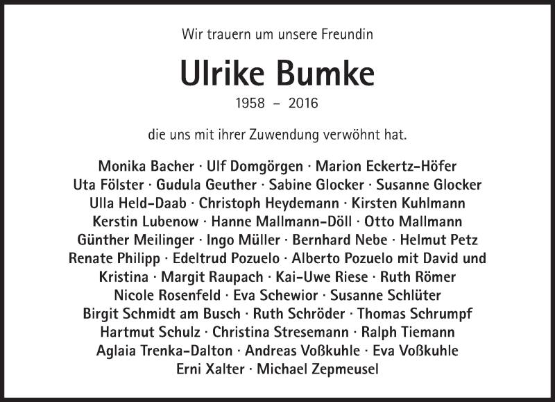 Hier finden Sie alle Traueranzeigen aus der Zeitung, die bisher für Ulrike Bumke erschienen sind. Weitere Traueranzeigen, die in der Zeitung erscheinen, werden hier ebenfalls aufgelistet
