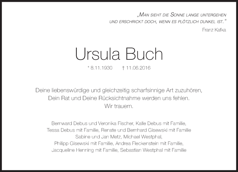 Hier finden Sie alle Traueranzeigen aus der Zeitung, die bisher für Ursula Buch erschienen sind. Weitere Traueranzeigen, die in der Zeitung erscheinen, werden hier ebenfalls aufgelistet