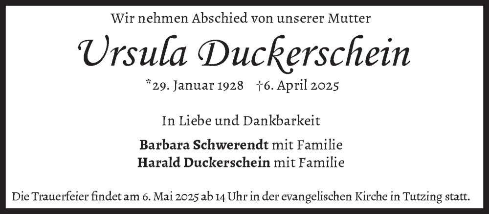 Hier finden Sie alle Traueranzeigen aus der Zeitung, die bisher für Ursula Duckerschein erschienen sind. Weitere Traueranzeigen, die in der Zeitung erscheinen, werden hier ebenfalls aufgelistet