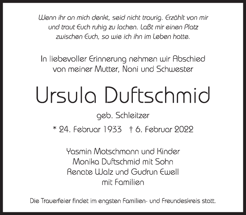 Hier finden Sie alle Traueranzeigen aus der Zeitung, die bisher für Ursula Duftschmid erschienen sind. Weitere Traueranzeigen, die in der Zeitung erscheinen, werden hier ebenfalls aufgelistet