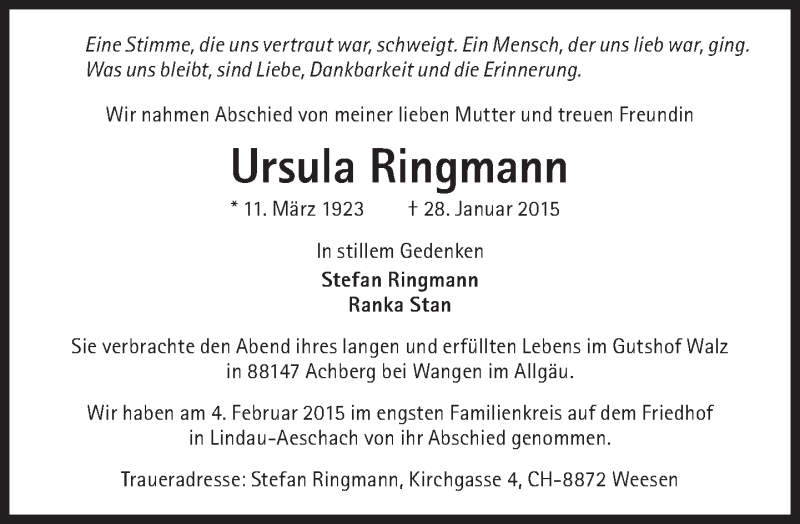 Hier finden Sie alle Traueranzeigen aus der Zeitung, die bisher für Ursula Ringmann erschienen sind. Weitere Traueranzeigen, die in der Zeitung erscheinen, werden hier ebenfalls aufgelistet