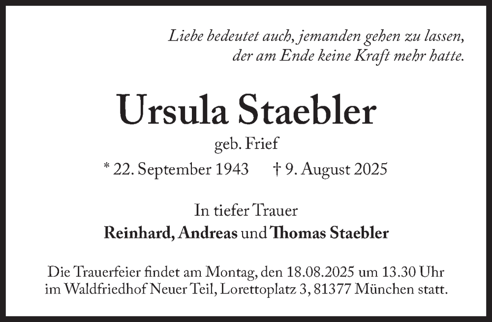 Hier finden Sie alle Traueranzeigen aus der Zeitung, die bisher für Ursula Staebler erschienen sind. Weitere Traueranzeigen, die in der Zeitung erscheinen, werden hier ebenfalls aufgelistet