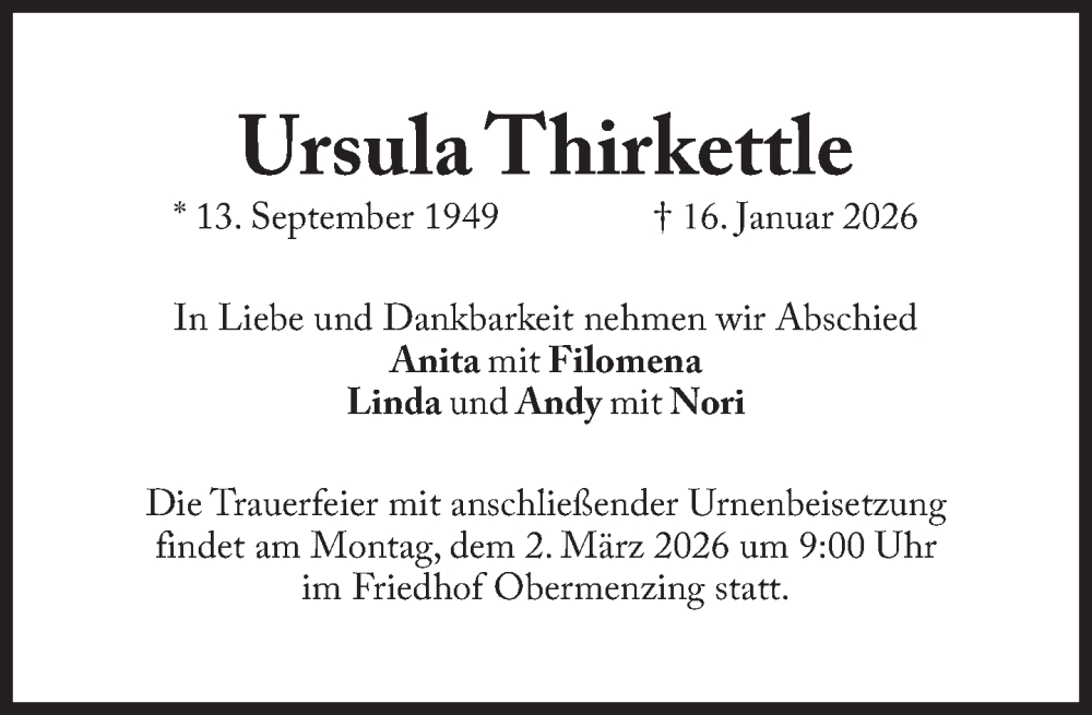 Hier finden Sie alle Traueranzeigen aus der Zeitung, die bisher für Ursula Thirkettle erschienen sind. Weitere Traueranzeigen, die in der Zeitung erscheinen, werden hier ebenfalls aufgelistet