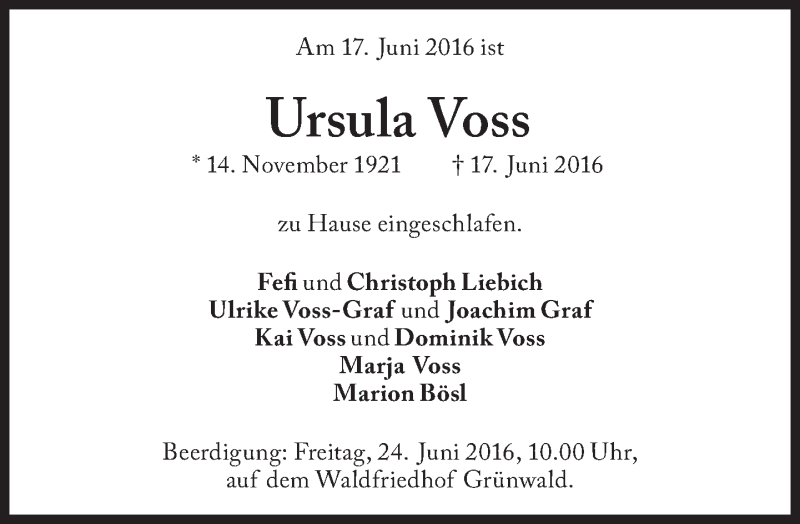 Hier finden Sie alle Traueranzeigen aus der Zeitung, die bisher für Ursula Voss erschienen sind. Weitere Traueranzeigen, die in der Zeitung erscheinen, werden hier ebenfalls aufgelistet