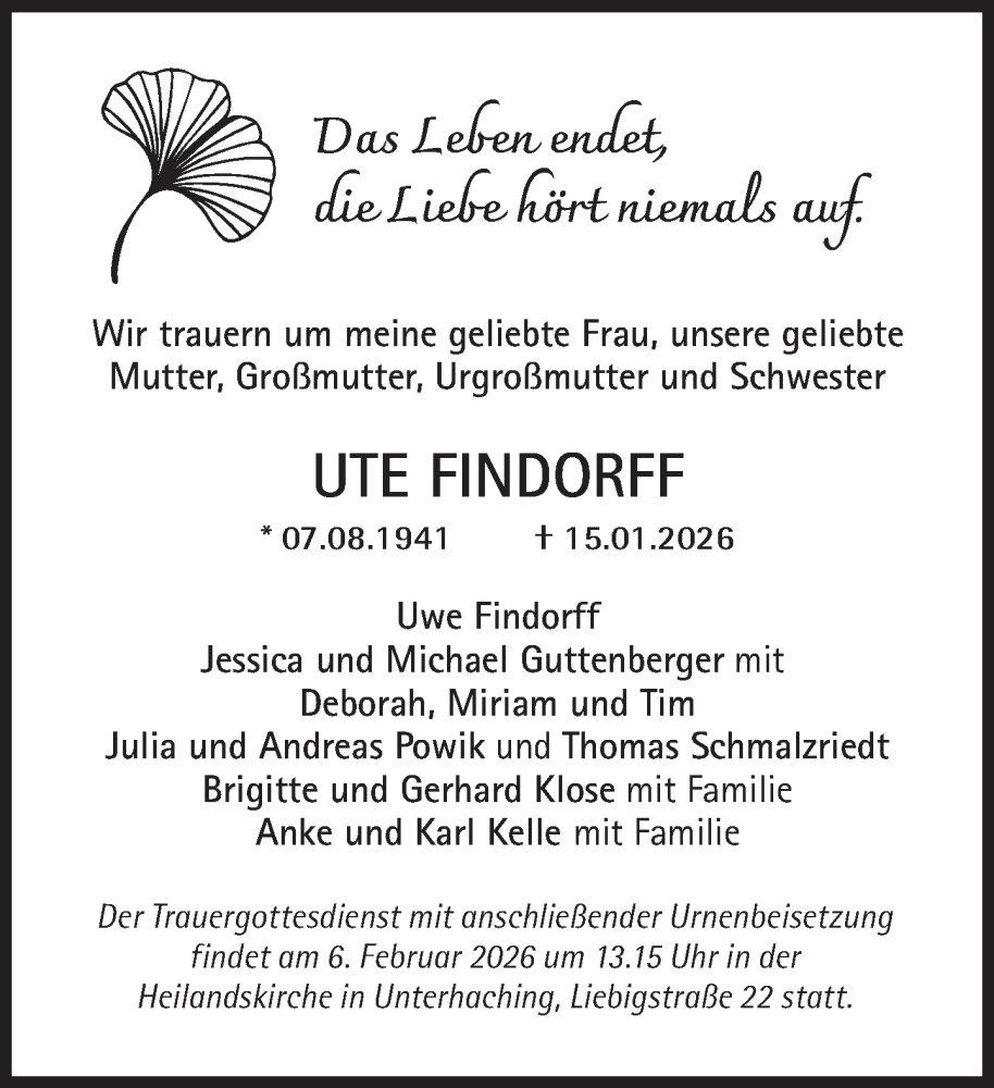 Hier finden Sie alle Traueranzeigen aus der Zeitung, die bisher für Ute Findorff erschienen sind. Weitere Traueranzeigen, die in der Zeitung erscheinen, werden hier ebenfalls aufgelistet