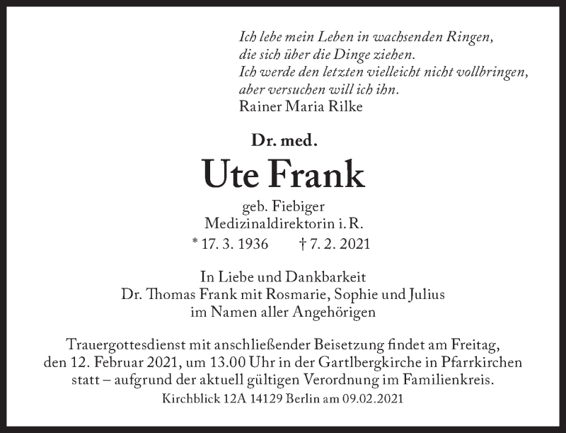 Hier finden Sie alle Traueranzeigen aus der Zeitung, die bisher für Ute Frank erschienen sind. Weitere Traueranzeigen, die in der Zeitung erscheinen, werden hier ebenfalls aufgelistet