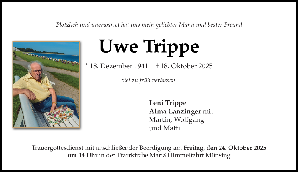 Hier finden Sie alle Traueranzeigen aus der Zeitung, die bisher für Uwe Trippe erschienen sind. Weitere Traueranzeigen, die in der Zeitung erscheinen, werden hier ebenfalls aufgelistet