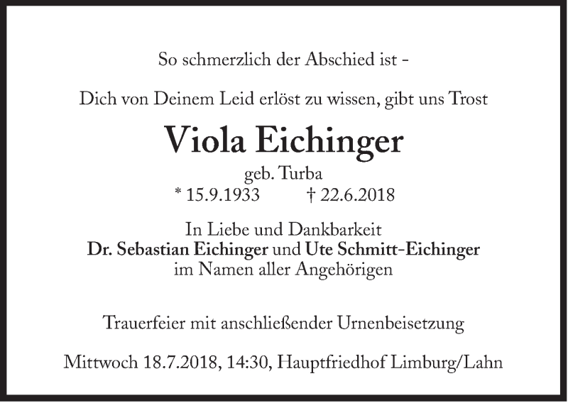 Hier finden Sie alle Traueranzeigen aus der Zeitung, die bisher für Viola Eichinger erschienen sind. Weitere Traueranzeigen, die in der Zeitung erscheinen, werden hier ebenfalls aufgelistet