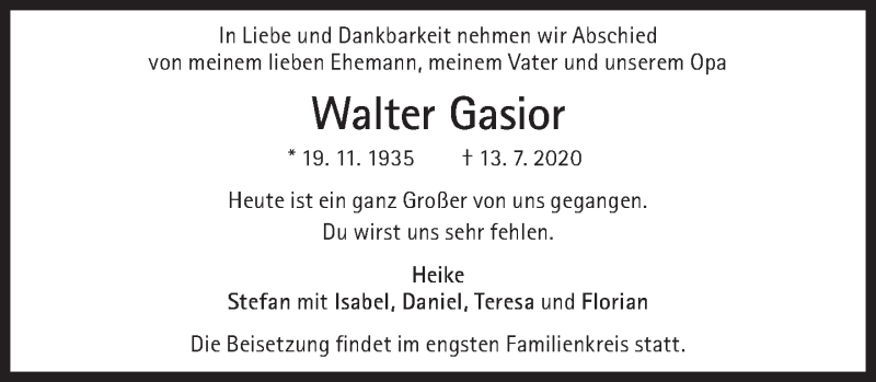 Hier finden Sie alle Traueranzeigen aus der Zeitung, die bisher für Walter Gasior erschienen sind. Weitere Traueranzeigen, die in der Zeitung erscheinen, werden hier ebenfalls aufgelistet