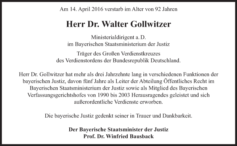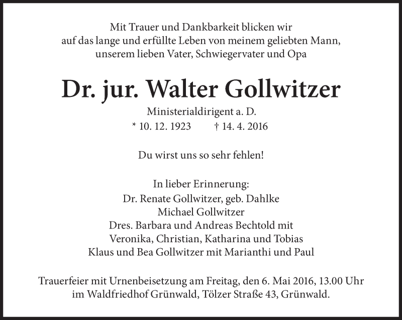 Hier finden Sie alle Traueranzeigen aus der Zeitung, die bisher für Walter Gollwitzer erschienen sind. Weitere Traueranzeigen, die in der Zeitung erscheinen, werden hier ebenfalls aufgelistet